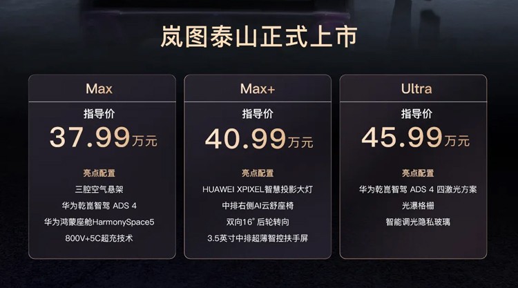在车企集中布局全尺寸SUV的当下,岚图汽车自然不会闲着,就在本月18号,品牌旗舰SUV岚图泰山正式上市,新车搭载三腔空气悬架,拥有华为ADS Ultra四激光雷达智能辅助驾驶方案、最新版鸿蒙座舱语音大模型等加持,此次推出4款车型,售价37.99-50.99万元(注:岚图泰山黑武士版将限量发售,明年一季度与大家见面)。