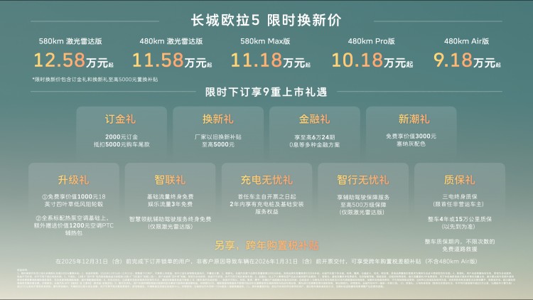 本次上市的欧拉5共推出5款配置车型,官方指导价格区间为9.98万至13.38万元,同步推出限时换新权益,优惠后起售价低至9.18万元,该价格包含“订金礼”及至高5000元“换新礼”以旧换新补贴,权益有效期至2025年12月31日。除价格优惠外,上市权益还涵盖智行无忧礼、跨年购置税补贴(480km Air版除外)等共计9重购车福利。