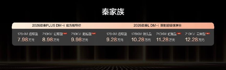 2026年1月8日,比亚迪秦家族正式推出两款重磅新车——2026款秦L DM-i 210KM长续航版与2026款秦PLUS DM-i 210KM长续航版,双车同步完成上市布局。此次上市车型售价区间覆盖8.98万-12.28万元,其中2026款秦L DM-i 210KM长续航版推出限时优享价11.28万-12.28万元,2026款秦PLUS DM-i 210KM长续航版官方售价8.98万-9.98万元,同步配套推出系列上市权益。