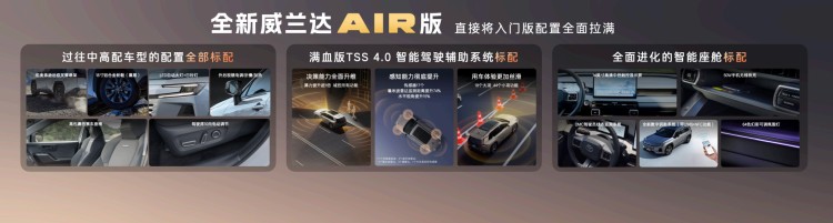 更打破行业惯例的是,全新换代威兰达AIR版不以“低价=低配”为潜规则,反而做到了“入门配置拉满”。以往中高配车型专属的真皮方向盘、高级皮质座椅、外后视镜折叠加热、50W无线快充、64色氛围灯等舒适配置,以及全面进化的智能座舱和油车里最好用的L2级丰田TSS 4.0智能驾驶系统,均是标配。这意味着用户无需在预算和心仪配置之间艰难抉择,一步到位即可享受全方位的满配与科技体验,彻底告别“套路式选装”。