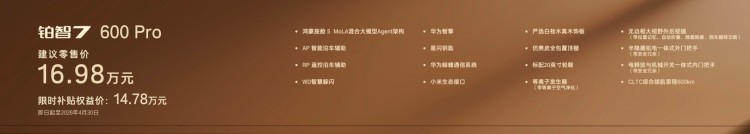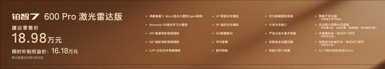 铂智7 600Pro版,版本基础配置不基础,入门即豪华,限时补贴权益价14.78万。同价位最大尺寸旗舰轿车,标配内置MoLA架构的鸿蒙座舱5,具备类人化智能交互,搭载带智能泊车的L2级智驾、华为智擎、尊界同款星闪钥匙、纯天然实木内饰和座椅通风加热、20寸轮毂等超15项豪华配置。D级车的尺寸和享受,B级车的价位,加上丰田全球品质兜底,性价比断层领先。