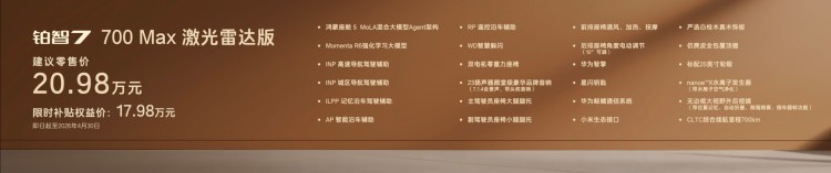 700km续航提供三个版本,全部标配双电机零重力座椅、主驾大腿托、后排智能触控面板和23扬声器等超11项配置,过往30万以上车型的豪华舒适配置,全部下放到20万以下。700Max版聚焦长续航与高阶舒适,限时补贴权益价16.58万,加5000元即可选装行业最低价的双腔空悬,拥有17万级双腔空悬纯电家轿第一车。700Max激光雷达版限时补贴权益价17.48万,增加Momenta R6大模型高阶智驾辅助。再加5000元选装基金即可升级至700Max激光雷达双腔空悬版,一次性配齐华为鸿蒙座舱5、Momenta R6大模型激光雷达智驾、双腔空悬等超豪华三件套,20万内唯一。